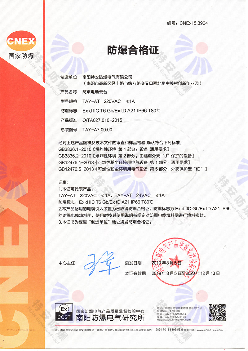 防爆電動云臺防爆合格證